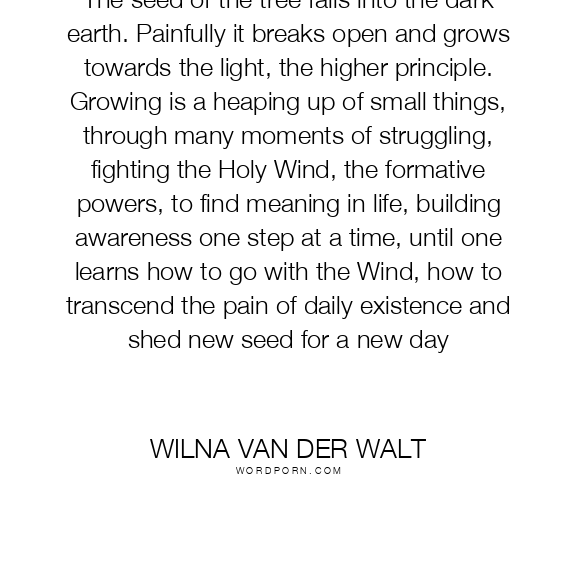 The seed of the tree falls into the dark earth. Painfully it breaks open and grows towards the light, the higher principle. Growing is a heaping up of small things, through many moments of struggling, fighting the Holy Wind, the formative powers, to find meaning in life, building awareness one step at a time, until one learns how to go with the Wind, how to transcend the pain of daily existence and shed new seed for a new day