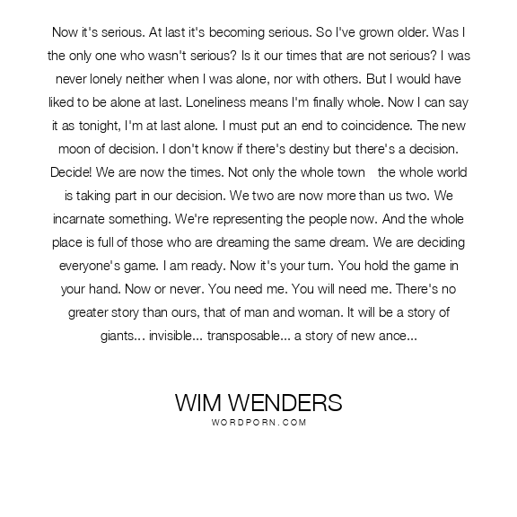 Now it's serious. At last it's becoming serious. So I've grown older. Was I the only one who wasn't serious? Is it our times that are not serious? I was never lonely neither when I was alone, nor with others. But I would have liked to be alone at last. Loneliness means I'm finally whole. Now I can say it as tonight, I'm at last alone. I must put an end to coincidence. The new moon of decision. I don't know if there's destiny but there's a decision. Decide! We are now the times. Not only the whole town - the whole world is taking part in our decision. We two are now more than us two. We incarnate something. We're representing the people now. And the whole place is full of those who are dreaming the same dream. We are deciding everyone's game. I am ready. Now it's your turn. You hold the game in your hand. Now or never. You need me. You will need me. There's no greater story than ours, that of man and woman. It will be a story of giants... invisible... transposable... a story of new ancestors. Look. My eyes. They are the picture of necessity, of the future of everyone in the place. Last night I dreamt of a stranger... of my man. Only with him could I be alone, open up to him, wholly open, wholly for him. Welcome him wholly into me. Surround him with the labyrinth of shared happiness. I know... it's you