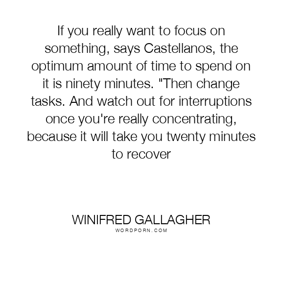 If you really want to focus on something, says Castellanos, the optimum amount of time to spend on it is ninety minutes. "Then change tasks. And watch out for interruptions once you're really concentrating, because it will take you twenty minutes to recover