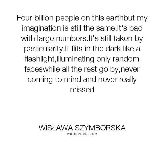Four billion people on this earthbut my imagination is still the same.It's bad with large numbers.It's still taken by particularity.It flits in the dark like a flashlight,illuminating only random faceswhile all the rest go by,never coming to mind and never really missed