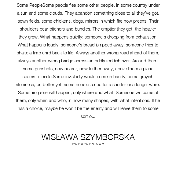 Some PeopleSome people flee some other people. In some country under a sun and some clouds. They abandon something close to all they’ve got, sown fields, some chickens, dogs, mirrors in which fire now preens. Their shoulders bear pitchers and bundles. The emptier they get, the heavier they grow. What happens quietly: someone’s dropping from exhaustion. What happens loudly: someone’s bread is ripped away, someone tries to shake a limp child back to life. Always another wrong road ahead of them, always another wrong bridge across an oddly reddish river. Around them, some gunshots, now nearer, now farther away, above them a plane seems to circle.Some invisibility would come in handy, some grayish stoniness, or, better yet, some nonexistence for a shorter or a longer while. Something else will happen, only where and what. Someone will come at them, only when and who, in how many shapes, with what intentions. If he has a choice, maybe he won’t be the enemy and will leave them to some sort of life