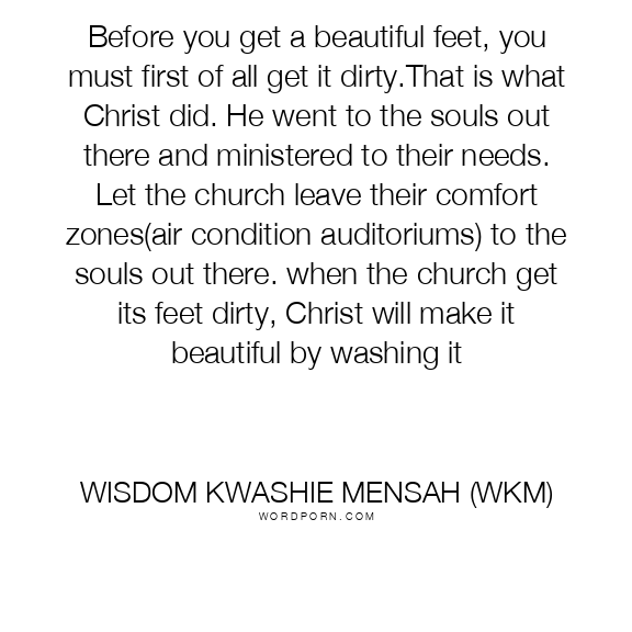 Before you get a beautiful feet, you must first of all get it dirty.That is what Christ did. He went to the souls out there and ministered to their needs. Let the church leave their comfort zones(air condition auditoriums) to the souls out there. when the church get its feet dirty, Christ will make it beautiful by washing it