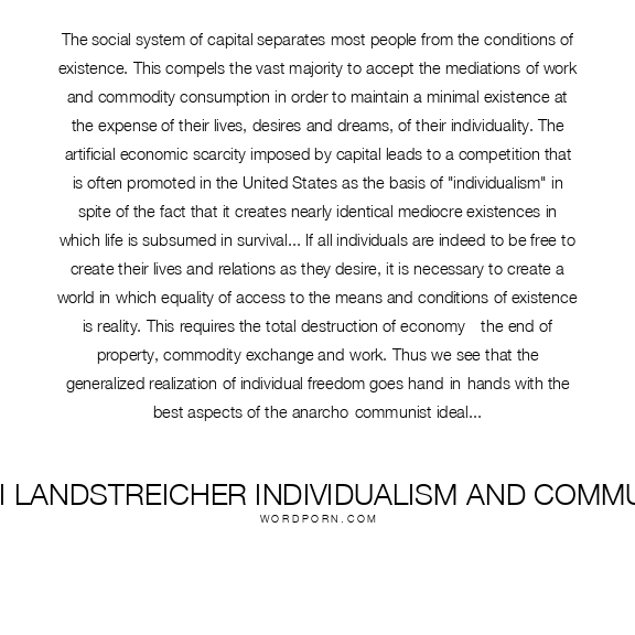 The social system of capital separates most people from the conditions of existence. This compels the vast majority to accept the mediations of work and commodity consumption in order to maintain a minimal existence at the expense of their lives, desires and dreams, of their individuality. The artificial economic scarcity imposed by capital leads to a competition that is often promoted in the United States as the basis of "individualism" in spite of the fact that it creates nearly identical mediocre existences in which life is subsumed in survival... If all individuals are indeed to be free to create their lives and relations as they desire, it is necessary to create a world in which equality of access to the means and conditions of existence is reality. This requires the total destruction of economy—the end of property, commodity exchange and work. Thus we see that the generalized realization of individual freedom goes hand-in-hands with the best aspects of the anarcho-communist ideal and can only be achieved through a revolutionary transformation