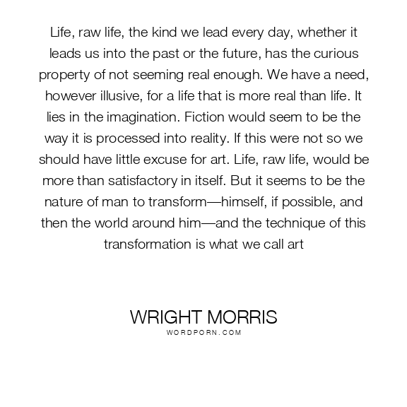 Life, raw life, the kind we lead every day, whether it leads us into the past or the future, has the curious property of not seeming real enough. We have a need, however illusive, for a life that is more real than life. It lies in the imagination. Fiction would seem to be the way it is processed into reality. If this were not so we should have little excuse for art. Life, raw life, would be more than satisfactory in itself. But it seems to be the nature of man to transform—himself, if possible, and then the world around him—and the technique of this transformation is what we call art