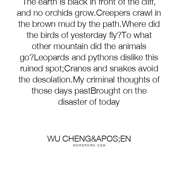 The earth is black in front of the cliff, and no orchids grow.Creepers crawl in the brown mud by the path.Where did the birds of yesterday fly?To what other mountain did the animals go?Leopards and pythons dislike this ruined spot;Cranes and snakes avoid the desolation.My criminal thoughts of those days pastBrought on the disaster of today