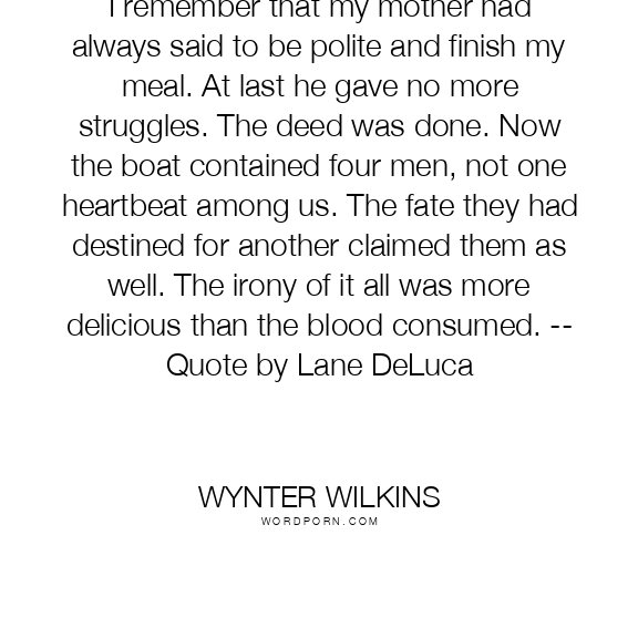 I remember that my mother had always said to be polite and finish my meal. At last he gave no more struggles. The deed was done. Now the boat contained four men, not one heartbeat among us. The fate they had destined for another claimed them as well. The irony of it all was more delicious than the blood consumed. -- Quote by Lane DeLuca