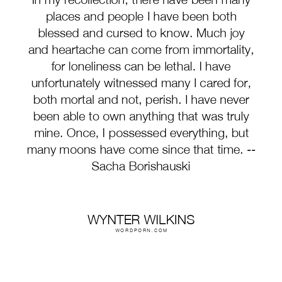 In my recollection, there have been many places and people I have been both blessed and cursed to know. Much joy and heartache can come from immortality, for loneliness can be lethal. I have unfortunately witnessed many I cared for, both mortal and not, perish. I have never been able to own anything that was truly mine. Once, I possessed everything, but many moons have come since that time. -- Sacha Borishauski
