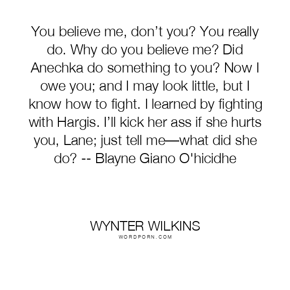 You believe me, don’t you? You really do. Why do you believe me? Did Anechka do something to you? Now I owe you; and I may look little, but I know how to fight. I learned by fighting with Hargis. I’ll kick her ass if she hurts you, Lane; just tell me—what did she do? -- Blayne Giano O'hicidhe