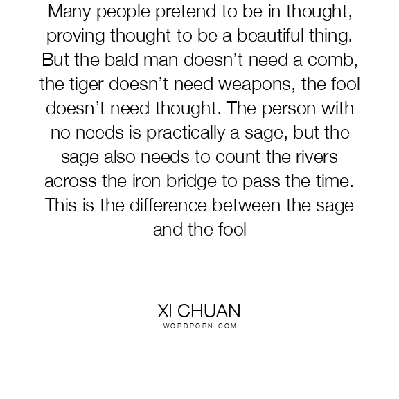 Many people pretend to be in thought, proving thought to be a beautiful thing. But the bald man doesn’t need a comb, the tiger doesn’t need weapons, the fool doesn’t need thought. The person with no needs is practically a sage, but the sage also needs to count the rivers across the iron bridge to pass the time. This is the difference between the sage and the fool