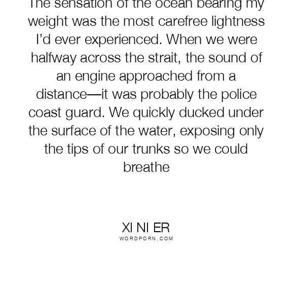 The sensation of the ocean bearing my weight was the most carefree lightness I’d ever experienced. When we were halfway across the strait, the sound of an engine approached from a distance—it was probably the police coast guard. We quickly ducked under the surface of the water, exposing only the tips of our trunks so we could breathe