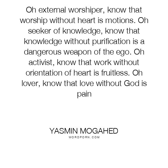 Oh external worshiper, know that worship without heart is motions. Oh seeker of knowledge, know that knowledge without purification is a dangerous weapon of the ego. Oh activist, know that work without orientation of heart is fruitless. Oh lover, know that love without God is pain