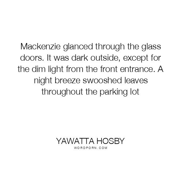 Mackenzie glanced through the glass doors. It was dark outside, except for the dim light from the front entrance. A night breeze swooshed leaves throughout the parking lot