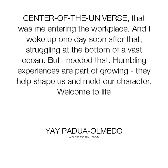 CENTER-OF-THE-UNIVERSE, that was me entering the workplace. And I woke up one day soon after that, struggling at the bottom of a vast ocean. But I needed that. Humbling experiences are part of growing - they help shape us and mold our character. Welcome to life