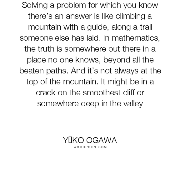 Solving a problem for which you know there’s an answer is like climbing a mountain with a guide, along a trail someone else has laid. In mathematics, the truth is somewhere out there in a place no one knows, beyond all the beaten paths. And it’s not always at the top of the mountain. It might be in a crack on the smoothest cliff or somewhere deep in the valley