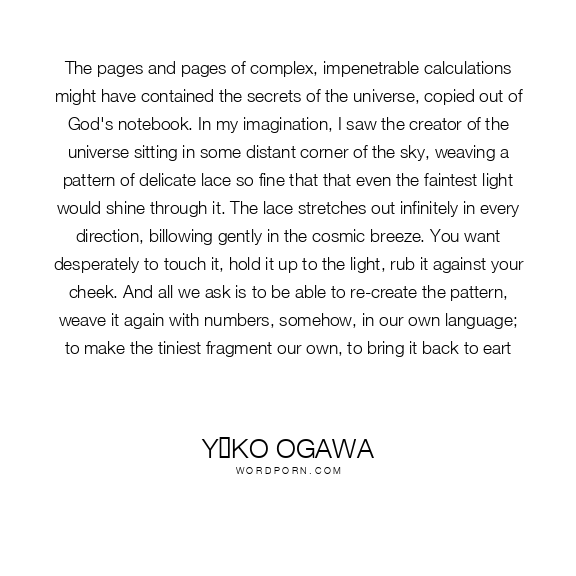 The pages and pages of complex, impenetrable calculations might have contained the secrets of the universe, copied out of God's notebook. In my imagination, I saw the creator of the universe sitting in some distant corner of the sky, weaving a pattern of delicate lace so fine that that even the faintest light would shine through it. The lace stretches out infinitely in every direction, billowing gently in the cosmic breeze. You want desperately to touch it, hold it up to the light, rub it against your cheek. And all we ask is to be able to re-create the pattern, weave it again with numbers, somehow, in our own language; to make the tiniest fragment our own, to bring it back to eart