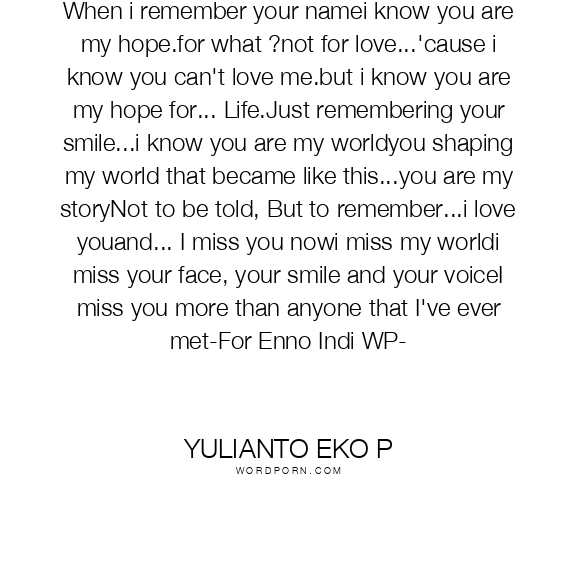 When i remember your namei know you are my hope.for what ?not for love...'cause i know you can't love me.but i know you are my hope for... Life.Just remembering your smile...i know you are my worldyou shaping my world that became like this...you are my storyNot to be told, But to remember...i love youand... I miss you nowi miss my worldi miss your face, your smile and your voiceI miss you more than anyone that I've ever met-For Enno Indi WP-