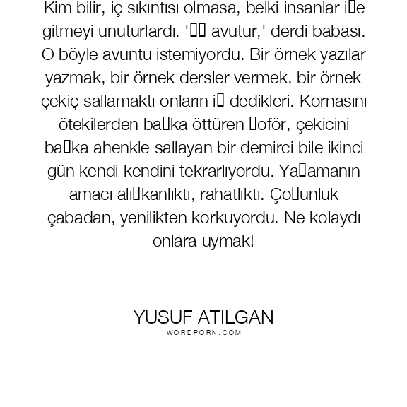 Kim bilir, iç sıkıntısı olmasa, belki insanlar işe gitmeyi unuturlardı. 'İş avutur,' derdi babası. O böyle avuntu istemiyordu. Bir örnek yazılar yazmak, bir örnek dersler vermek, bir örnek çekiç sallamaktı onların iş dedikleri. Kornasını ötekilerden başka öttüren şoför, çekicini başka ahenkle sallayan bir demirci bile ikinci gün kendi kendini tekrarlıyordu. Yaşamanın amacı alışkanlıktı, rahatlıktı. Çoğunluk çabadan, yenilikten korkuyordu. Ne kolaydı onlara uymak!