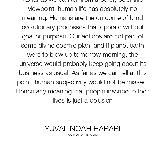 As far as we can tell from a purely scientific viewpoint, human life has absolutely no meaning. Humans are the outcome of blind evolutionary processes that operate without goal or purpose. Our actions are not part of some divine cosmic plan, and if planet earth were to blow up tomorrow morning, the universe would probably keep going about its business as usual. As far as we can tell at this point, human subjectivity would not be missed. Hence any meaning that people inscribe to their lives is just a delusion