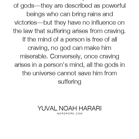 Buddhism does not deny the existence of gods—they are described as powerful beings who can bring rains and victories—but they have no influence on the law that suffering arises from craving. If the mind of a person is free of all craving, no god can make him miserable. Conversely, once craving arises in a person's mind, all the gods in the universe cannot save him from suffering