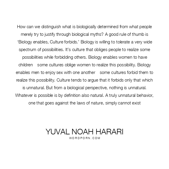 How can we distinguish what is biologically determined from what people merely try to justify through biological myths? A good rule of thumb is ‘Biology enables, Culture forbids.’ Biology is willing to tolerate a very wide spectrum of possibilities. It’s culture that obliges people to realize some possibilities while forbidding others. Biology enables women to have children – some cultures oblige women to realize this possibility. Biology enables men to enjoy sex with one another – some cultures forbid them to realize this possibility. Culture tends to argue that it forbids only that which is unnatural. But from a biological perspective, nothing is unnatural. Whatever is possible is by definition also natural. A truly unnatural behavior, one that goes against the laws of nature, simply cannot exist