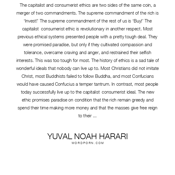 The capitalist and consumerist ethics are two sides of the same coin, a merger of two commandments. The supreme commandment of the rich is ‘Invest!’ The supreme commandment of the rest of us is ‘Buy!’ The capitalist–consumerist ethic is revolutionary in another respect. Most previous ethical systems presented people with a pretty tough deal. They were promised paradise, but only if they cultivated compassion and tolerance, overcame craving and anger, and restrained their selfish interests. This was too tough for most. The history of ethics is a sad tale of wonderful ideals that nobody can live up to. Most Christians did not imitate Christ, most Buddhists failed to follow Buddha, and most Confucians would have caused Confucius a temper tantrum. In contrast, most people today successfully live up to the capitalist–consumerist ideal. The new ethic promises paradise on condition that the rich remain greedy and spend their time making more money and that the masses give free reign to their cravings and passions and buy more and more. This is the first religion in history whose followers actually do what they are asked to do. How though do we know that we'll really get paradise in return? We've seen it on television