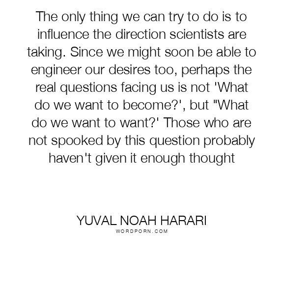 The only thing we can try to do is to influence the direction scientists are taking. Since we might soon be able to engineer our desires too, perhaps the real questions facing us is not 'What do we want to become?', but "What do we want to want?' Those who are not spooked by this question probably haven't given it enough thought