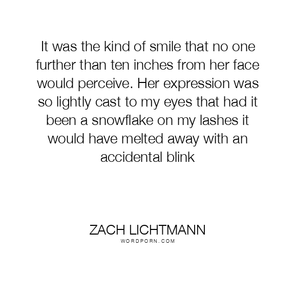 It was the kind of smile that no one further than ten inches from her face would perceive. Her expression was so lightly cast to my eyes that had it been a snowflake on my lashes it would have melted away with an accidental blink