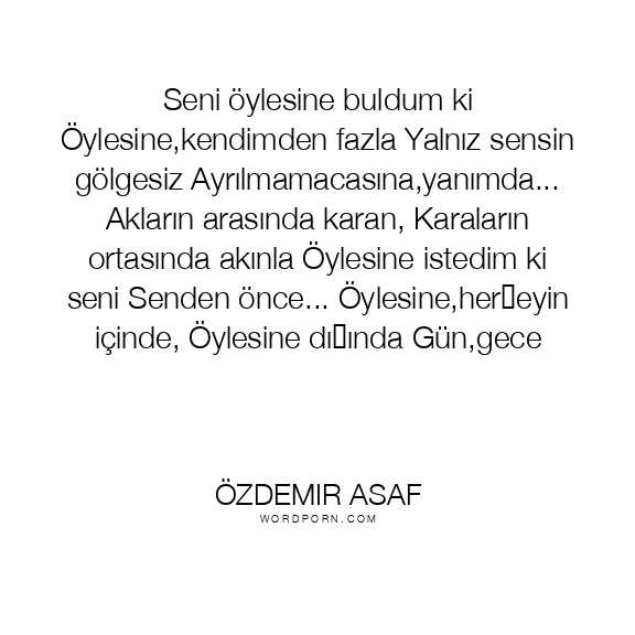 Seni öylesine buldum ki Öylesine,kendimden fazla Yalnız sensin gölgesiz Ayrılmamacasına,yanımda... Akların arasında karan, Karaların ortasında akınla Öylesine istedim ki seni Senden önce... Öylesine,herşeyin içinde, Öylesine dışında Gün,gece