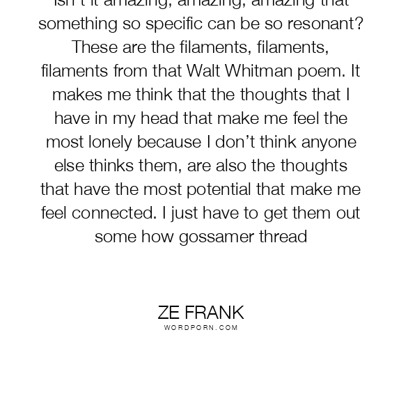 Isn’t it amazing, amazing, amazing that something so specific can be so resonant? These are the filaments, filaments, filaments from that Walt Whitman poem. It makes me think that the thoughts that I have in my head that make me feel the most lonely because I don’t think anyone else thinks them, are also the thoughts that have the most potential that make me feel connected. I just have to get them out some how gossamer thread