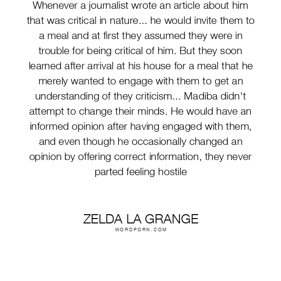 Whenever a journalist wrote an article about him that was critical in nature... he would invite them to a meal and at first they assumed they were in trouble for being critical of him. But they soon learned after arrival at his house for a meal that he merely wanted to engage with them to get an understanding of they criticism... Madiba didn't attempt to change their minds. He would have an informed opinion after having engaged with them, and even though he occasionally changed an opinion by offering correct information, they never parted feeling hostile