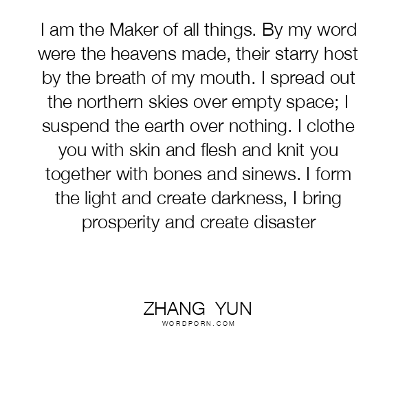 I am the Maker of all things. By my word were the heavens made, their starry host by the breath of my mouth. I spread out the northern skies over empty space; I suspend the earth over nothing. I clothe you with skin and flesh and knit you together with bones and sinews. I form the light and create darkness, I bring prosperity and create disaster
