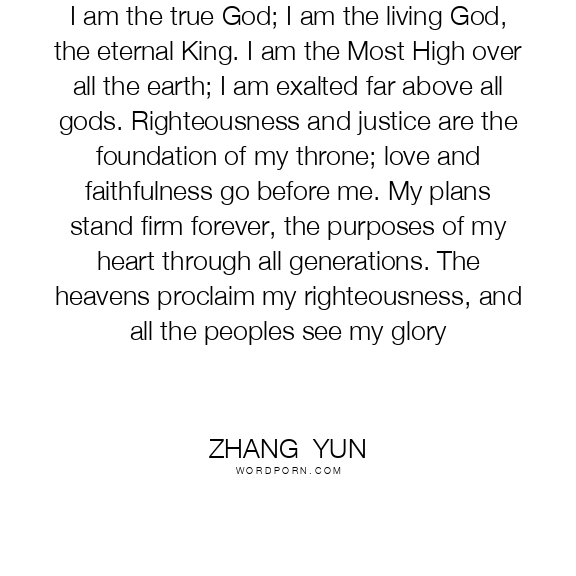 I am the true God; I am the living God, the eternal King. I am the Most High over all the earth; I am exalted far above all gods. Righteousness and justice are the foundation of my throne; love and faithfulness go before me. My plans stand firm forever, the purposes of my heart through all generations. The heavens proclaim my righteousness, and all the peoples see my glory