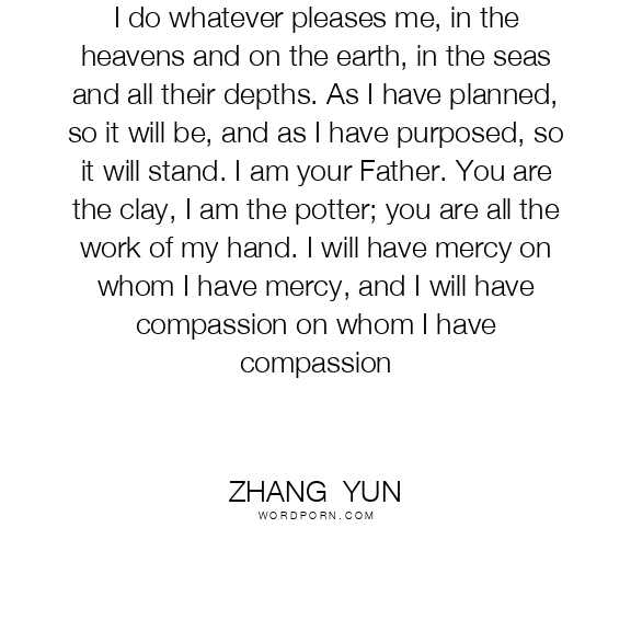I do whatever pleases me, in the heavens and on the earth, in the seas and all their depths. As I have planned, so it will be, and as I have purposed, so it will stand. I am your Father. You are the clay, I am the potter; you are all the work of my hand. I will have mercy on whom I have mercy, and I will have compassion on whom I have compassion