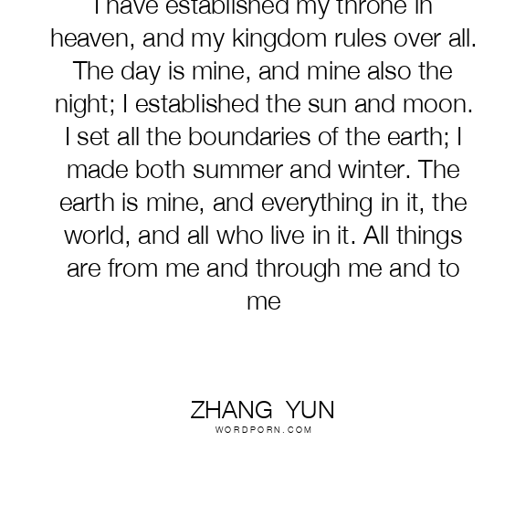 I have established my throne in heaven, and my kingdom rules over all. The day is mine, and mine also the night; I established the sun and moon. I set all the boundaries of the earth; I made both summer and winter. The earth is mine, and everything in it, the world, and all who live in it. All things are from me and through me and to me