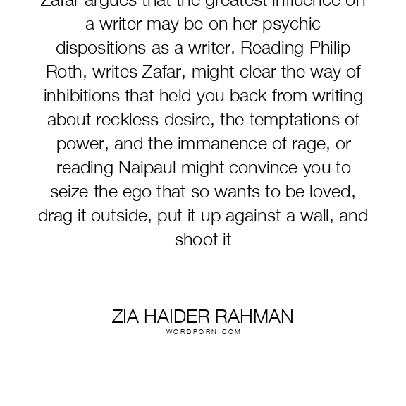 Zafar argues that the greatest influence on a writer may be on her psychic dispositions as a writer. Reading Philip Roth, writes Zafar, might clear the way of inhibitions that held you back from writing about reckless desire, the temptations of power, and the immanence of rage, or reading Naipaul might convince you to seize the ego that so wants to be loved, drag it outside, put it up against a wall, and shoot it