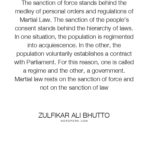 The sanction of force stands behind the medley of personal orders and regulations of Martial Law. The sanction of the people's consent stands behind the hierarchy of laws. In one situation, the population is regimented into acquiescence. In the other, the population voluntarily establishes a contract with Parliament. For this reason, one is called a regime and the other, a government. Martial law rests on the sanction of force and not on the sanction of law