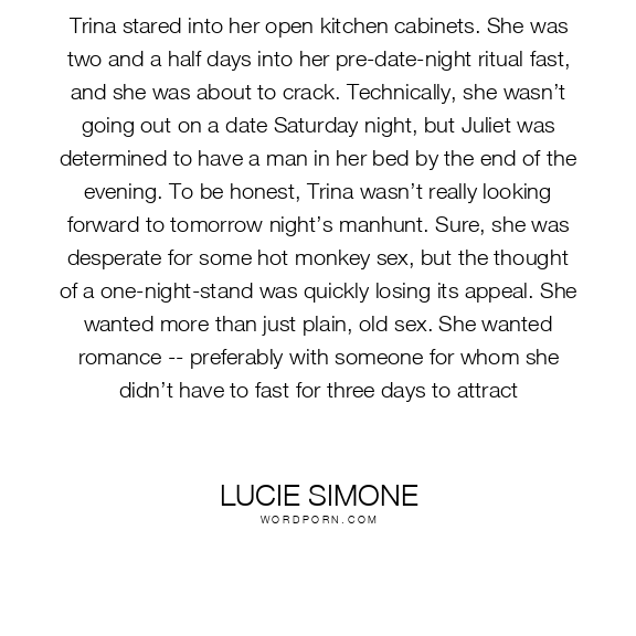 Trina stared into her open kitchen cabinets. She was two and a half days into her pre-date-night ritual fast, and she was about to crack. Technically, she wasn’t going out on a date Saturday night, but Juliet was determined to have a man in her bed by the end of the evening. To be honest, Trina wasn’t really looking forward to tomorrow night’s manhunt. Sure, she was desperate for some hot monkey sex, but the thought of a one-night-stand was quickly losing its appeal. She wanted more than just plain, old sex. She wanted romance -- preferably with someone for whom she didn’t have to fast for three days to attract