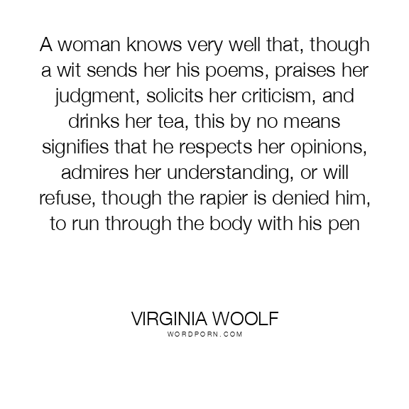 A woman knows very well that, though a wit sends her his poems, praises her judgment, solicits her criticism, and drinks her tea, this by no means signifies that he respects her opinions, admires her understanding, or will refuse, though the rapier is denied him, to run through the body with his pen
