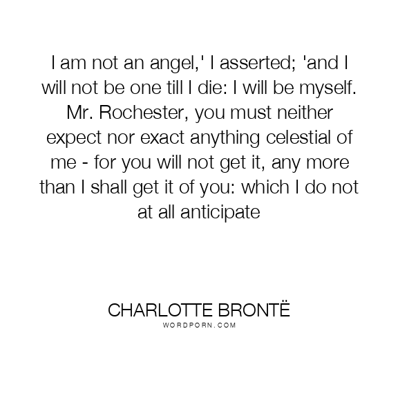 I am not an angel,' I asserted; 'and I will not be one till I die: I will be myself. Mr. Rochester, you must neither expect nor exact anything celestial of me - for you will not get it, any more than I shall get it of you: which I do not at all anticipate
