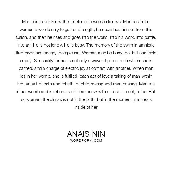 Man can never know the loneliness a woman knows. Man lies in the woman's womb only to gather strength, he nourishes himself from this fusion, and then he rises and goes into the world, into his work, into battle, into art. He is not lonely. He is busy. The memory of the swim in amniotic fluid gives him energy, completion. Woman may be busy too, but she feels empty. Sensuality for her is not only a wave of pleasure in which she is bathed, and a charge of electric joy at contact with another. When man lies in her womb, she is fulfilled, each act of love a taking of man within her, an act of birth and rebirth, of child rearing and man bearing. Man lies in her womb and is reborn each time anew with a desire to act, to be. But for woman, the climax is not in the birth, but in the moment man rests inside of her