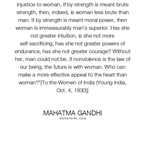 To call woman the weaker sex is a libel; it is man's injustice to woman. If by strength is meant brute strength, then, indeed, is woman less brute than man. If by strength is meant moral power, then woman is immeasurably man's superior. Has she not greater intuition, is she not more self-sacrificing, has she not greater powers of endurance, has she not greater courage? Without her, man could not be. If nonviolence is the law of our being, the future is with woman. Who can make a more effective appeal to the heart than woman?"[To the Women of India (Young India, Oct. 4, 1930)]
