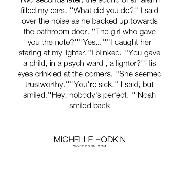 Two seconds later, the sound of an alarm filled my ears. ''What did you do?'' I said over the noise as he backed up towards the bathroom door. ''The girl who gave you the note?''''Yes...''''I caught her staring at my lighter.''I blinked. ''You gave a child, in a psych ward , a lighter?''His eyes crinkled at the corners. ''She seemed trustworthy.''''You're sick,'' I said, but smiled.''Hey, nobody's perfect. '' Noah smiled back