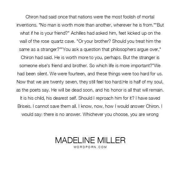 Chiron had said once that nations were the most foolish of mortal inventions. "No man is worth more than another, wherever he is from.""But what if he is your friend?" Achilles had asked him, feet kicked up on the wall of the rose-quartz cave. "Or your brother? Should you treat him the same as a stranger?""You ask a question that philosophers argue over," Chiron had said. He is worth more to you, perhaps. But the stranger is someone else's friend and brother. So which life is more important?"We had been silent. We were fourteen, and these things were too hard for us. Now that we are twenty-seven, they still feel too hard.He is half of my soul, as the poets say. He will be dead soon, and his honor is all that will remain. It is his child, his dearest self. Should I reproach him for it? I have saved Briseis. I cannot save them all. I know, now, how I would answer Chiron. I would say: there is no answer. Whichever you choose, you are wrong