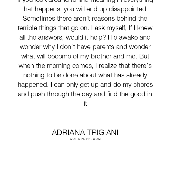 Adriana Trigiani quote. If you look around to find meaning in everything that happens, you will end up disappointed. Sometimes there aren’t reasons behind the terrible things that go on. I ask myself, If I knew all the answers, would it help? I lie awake and wonder why I don’t have parents and wonder what will become of my brother and me. But when the morning comes, I realize that there’s nothing to be done about what has already happened. I can only get up and do my chores and push through the day and find the good in it