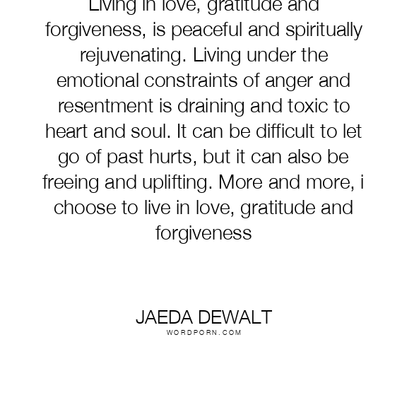Jaeda DeWalt quote. Living in love, gratitude and forgiveness, is peaceful and spiritually rejuvenating. Living under the emotional constraints of anger and resentment is draining and toxic to heart and soul. It can be difficult to let go of past hurts, but it can also be freeing and uplifting. More and more, i choose to live in love, gratitude and forgiveness