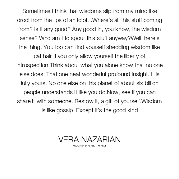 Vera Nazarian quote. Sometimes I think that wisdoms slip from my mind like drool from the lips of an idiot...Where's all this stuff coming from? Is it any good? Any good in, you know, the wisdom sense? Who am I to spout this stuff anyway?Well, here's the thing. You too can find yourself shedding wisdom like cat hair if you only allow yourself the liberty of introspection.Think about what you alone know that no one else does. That one neat wonderful profound insight. It is fully yours. No one else on this planet of about six billion people understands it like you do.Now, see if you can share it with someone. Bestow it, a gift of yourself.Wisdom is like gossip. Except it's the good kind