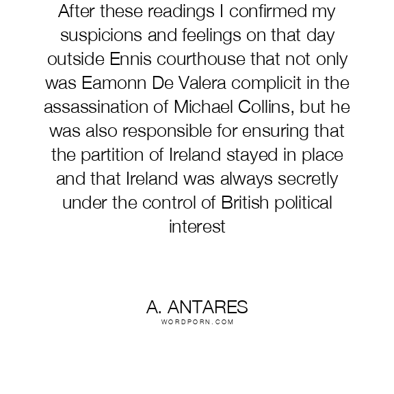 After these readings I confirmed my suspicions and feelings on that day outside Ennis courthouse that not only was Eamonn De Valera complicit in the assassination of Michael Collins, but he was also responsible for ensuring that the partition of Ireland stayed in place and that Ireland was always secretly under the control of British political interest
