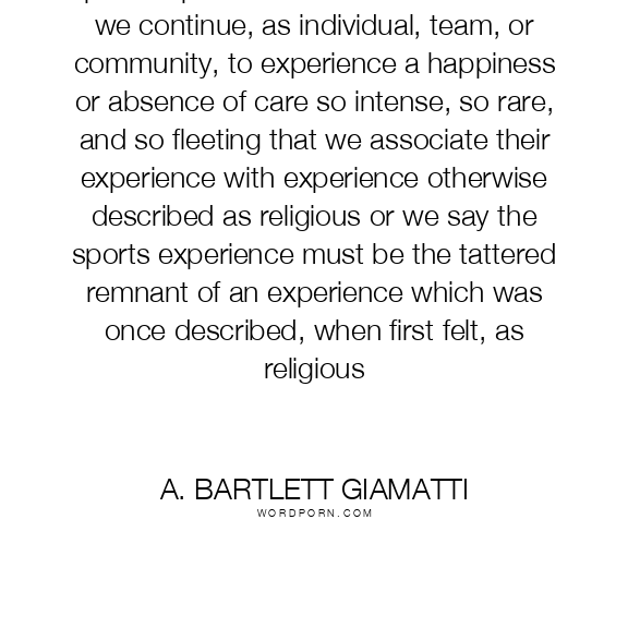 Sports represent a shared vision of how we continue, as individual, team, or community, to experience a happiness or absence of care so intense, so rare, and so fleeting that we associate their experience with experience otherwise described as religious or we say the sports experience must be the tattered remnant of an experience which was once described, when first felt, as religious
