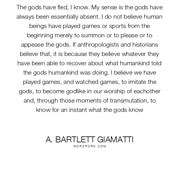 The gods have fled, I know. My sense is the gods have always been essentially absent. I do not believe human beings have played games or sports from the beginning merely to summon or to please or to appease the gods. If anthropologists and historians believe that, it is because they believe whatever they have been able to recover about what humankind told the gods humankind was doing. I believe we have played games, and watched games, to imitate the gods, to become godlike in our worship of eachother and, through those moments of transmutation, to know for an instant what the gods know