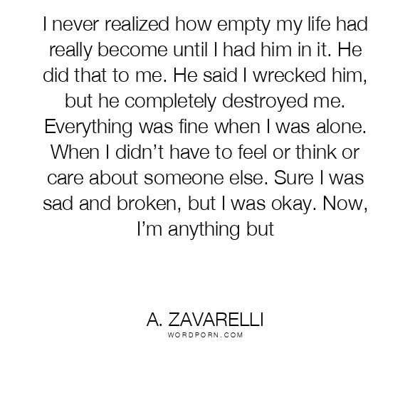 I never realized how empty my life had really become until I had him in it. He did that to me. He said I wrecked him, but he completely destroyed me. Everything was fine when I was alone. When I didn’t have to feel or think or care about someone else. Sure I was sad and broken, but I was okay. Now, I’m anything but